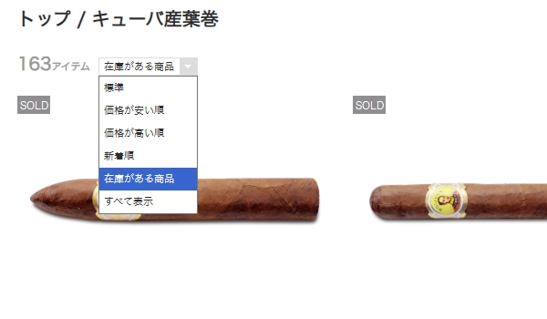 下記のキューバ産葉巻ページを開いて、ブランドロゴの左下のプルダウンメニュー[標準 ▽]から[在庫がある商品 ▽]を選んで、絞り込みをかけてください。在庫のあるキューバ産葉巻が一覧表示されるので、この中から予算に合った葉巻をお選びください。