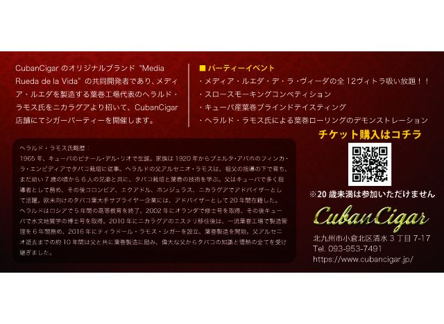 CubanCigarのオリジナルブランド“Media Rueda de la Vida”の共同開発者であり、メディア・ルエダを製造する葉巻工場代表のヘラルド・ラモス氏をニカラグアより招いて、CubanCigar(北九州市)にてシガーパーティーを開催します。